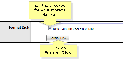 On the Format Disk section, tick the checkbox for the storage device and click on the Format Disk button.