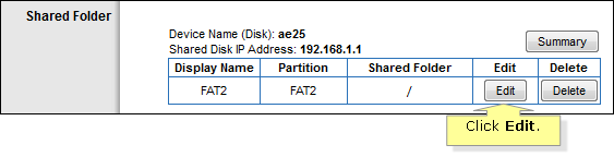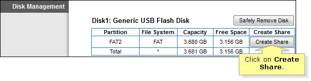 In the Disk Management/Disk Detail section, your USB storage device and its details should be displayed. To set up shares on your hard drive, follow the procedure below: